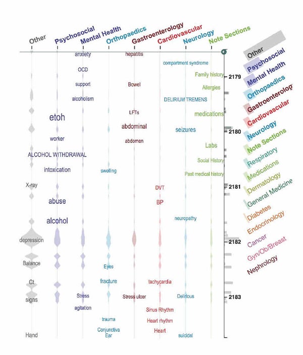 Their datasets include more than 300 pages of medical chart notes for each patient. Conditions mentioned throughout a medical chart are visualized as steamgraphs, string-like graphs with droplets that expand upon recurrence of terms. For example, a larger droplet around hypertension would mean it’s an issue for the patient. Each condition is labelled with a different colour.