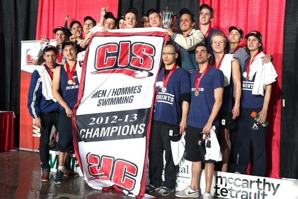 The Blues put an end to 18 years of domination by western Canadian teams, emerging victorious in an extraordinary three-way race to capture the 2013 CIS men's swimming title at the University of Calgary Aquatic Centre Feb 23, 2013.