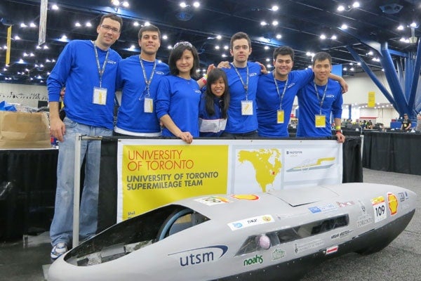 Though the 90-pound, 1.3 horsepower U of T car – powered by a Honda leafblower motor – failed to place in the final race because of technical problems, it did achieve an impressive 626 miles per gallon in the preliminary round.