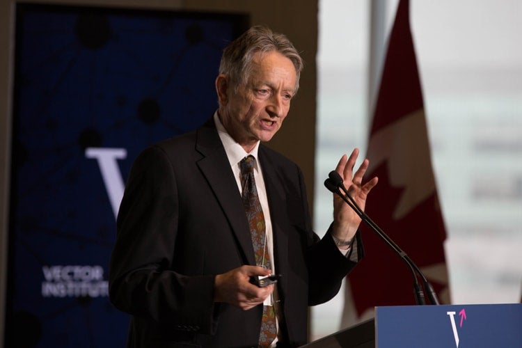 Using his time at the podium, Geoffrey Hinton, a U of T University Professor Emeritus in computer science and Vector’s new chief scientific adviser, deviated from the usual prepared remarks to deliver a pithy TED Talk-like PowerPoint on how neural networks and deep learning work.