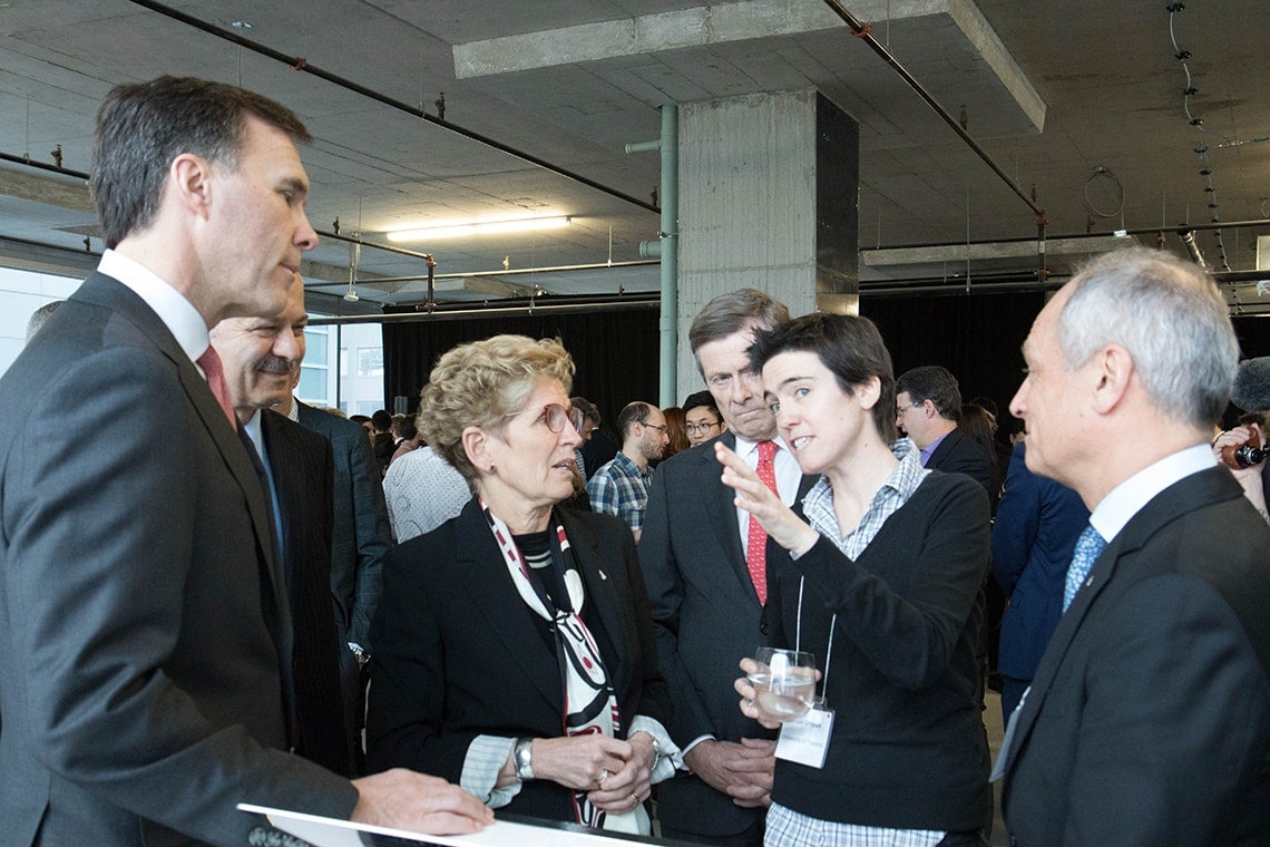 Sanja Fidler (right), an assistant professor of computer science at U of T, focuses on object recognition, 3D scene understanding, and combining vision and language. She explains her research at Thursday's event to (from left to right) Minister of Finance Bill Morneau, Premier Kathleen Wynne and Mayor John Tory (photo by Lisa Lightbourn)