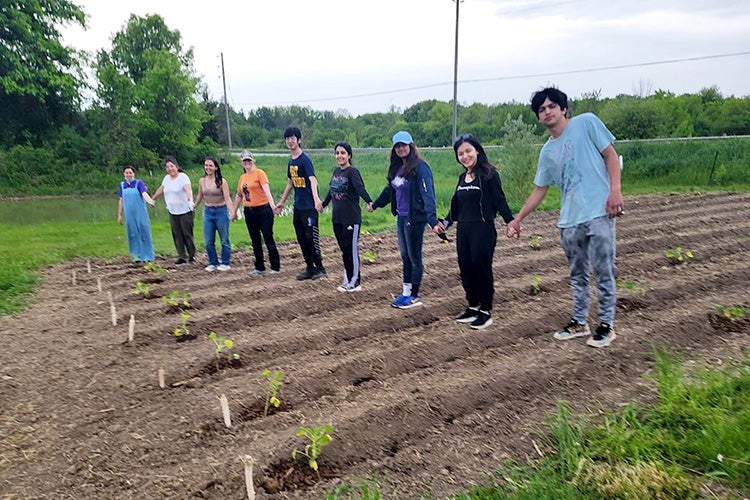 Students in the Indigenous Holistic Health course plant rows of corn and crookneck squash (photo by Terrylynn Brant)