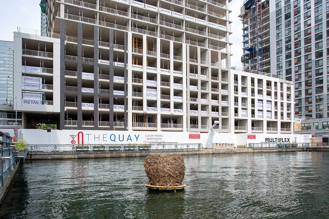 The sculpture, called “Tangle,” is made of refuse ranging from polypropylene bags to microplastic particles and discarded toys – all wrapped in willow branches and invasive plants found in Lake Ontario. It can be viewed in the Harbourfront neighbourhood’s Peter Street Basin until September.