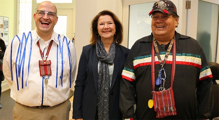 Left to right: Professor Jason Bazylak, Dean Cristina Amon and Elder Kim Running Bear McDougall at a reception following a smudging ceremony for the Centre for Engineering Innovation & Entrepreneurship, the Faculty of Applied Science & Engineering’s newest building (photo by Roberta Baker)