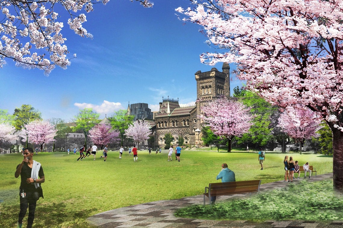 The plan will make the heart of the St. George campus more pedestrian friendly and accessible – a true urban park in the centre of downtown Toronto. New trees and gardens will be added, along with seating areas, pathways for walking and cycling and plazas where students, alumni and visitors can gather.