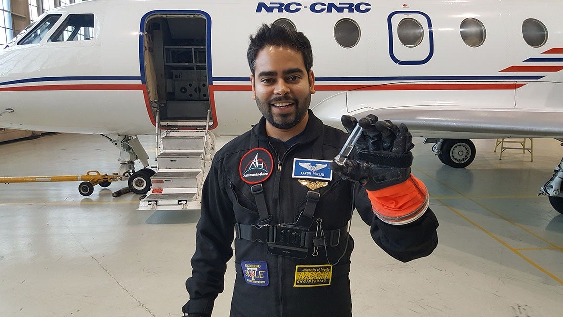 Persad’s dream of going to space began at the age of seven and his pursuit of it accelerated at U of T Engineering. During his undergraduate studies, he completed his Professional Experience Year internship at the CSA, including a flight in a Falcon-20 jet where he got experience the sensation of free-fall for the first time.