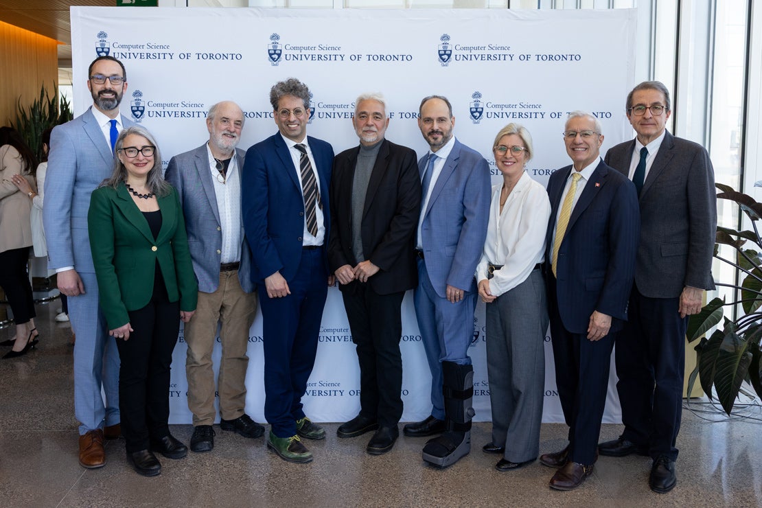 Representatives from the federal and provincial government, AMD and U of T came together to celebrate the launch of the AMD-U of T Research Lab (from left): Nolan Quinn, Leah Cowen, Scott Mabury, Karim Bardeesy, Andrej Zdravkovic, Eyal de Lara, Melanie Woodin, Victor Fedeli and Alejandro Adem (photo by Johnny Guatto)