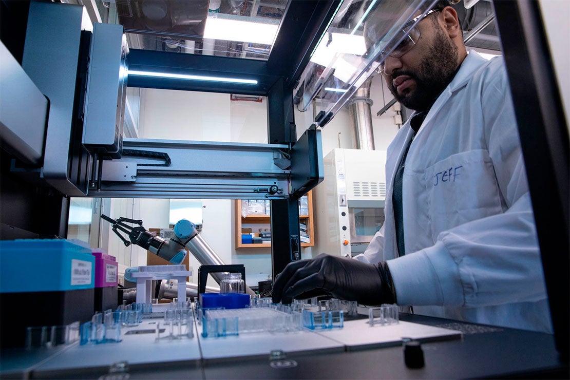 In the formulations lab at U of T's Acceleration Consortium, Staff Research Scientist Aaron Clasky uses AI and robotics to speed up the search for new chemical technologies (photo by Tyler Irving)