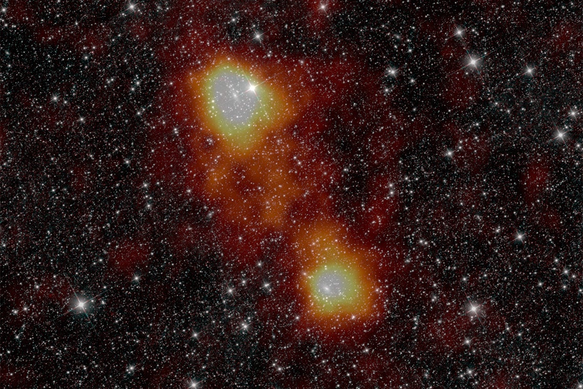 Lead Image: Gas measured by ACT+Planck (orange-red) superimposed over two galaxies observed by the Wide-field Infrared Survey Explorer (WISE). A filament of the cosmic web connects them.Photo credit: WISE data credit (CC-BY-4.0): unWISE/NASA/JPL-Caltech/D. Lang (Perimeter Institute). ACT+Planck map credit: ACT Collaboration.