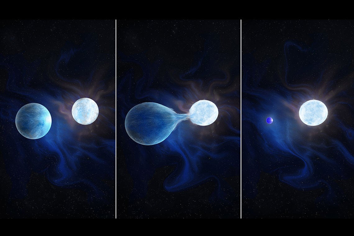 As stars evolve and expand to become red giants, the hydrogen at the outer edges of one can be stripped by the gravitational pull of its companion star – leaving a very hot helium core exposed. The process can take tens of thousands or even hundreds of thousands of years.