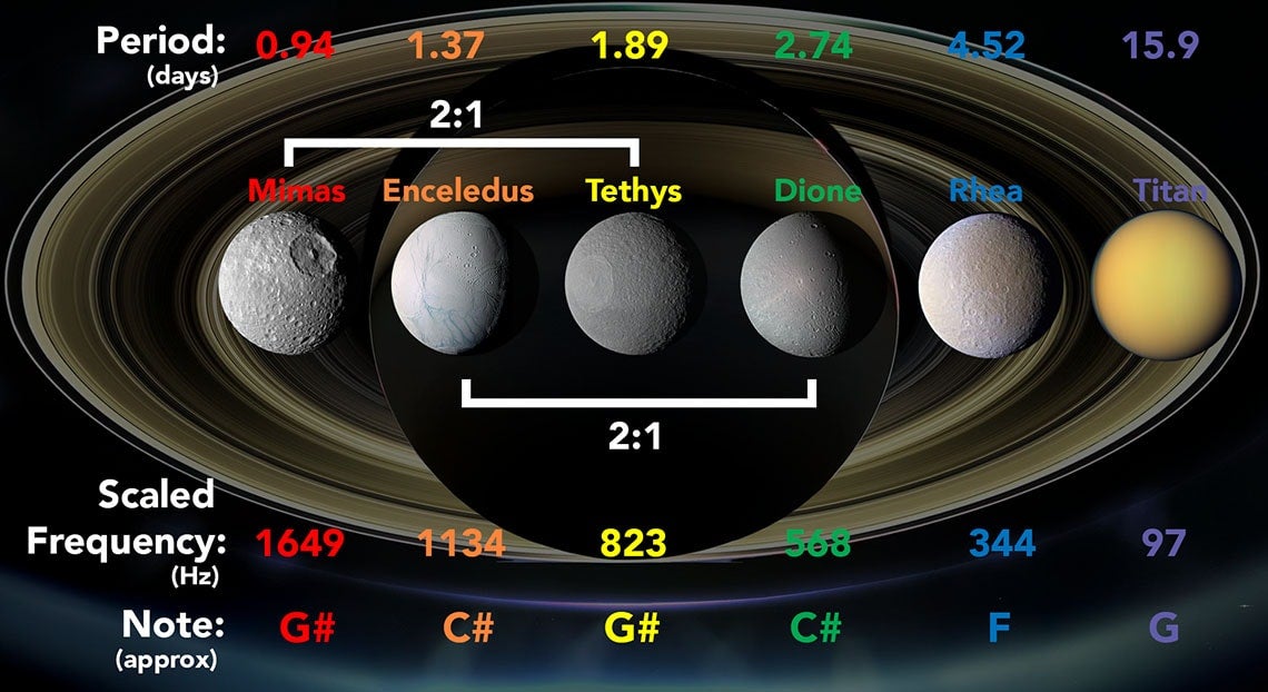 The conversion to music is made possible by orbital resonances, which occur when two objects execute different numbers of complete orbits in the same time, so that they keep returning to their initial configuration. The rhythmic gravitational tugs between them keep them locked in a tight repeating pattern that can also be converted directly into musical harmony.