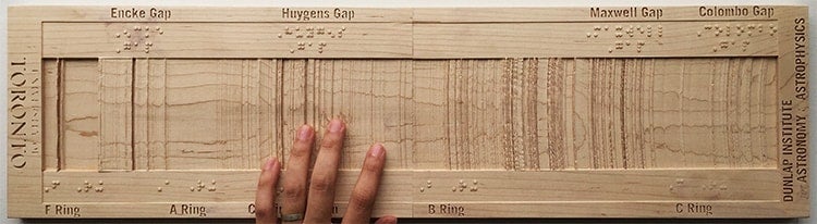 A wood carving of Saturn’s main ring system designed for the visually impaired. They will be able to feel many complex structures within the rings while also listening to their audio form. (photo courtesy of SYSTEM Sounds)