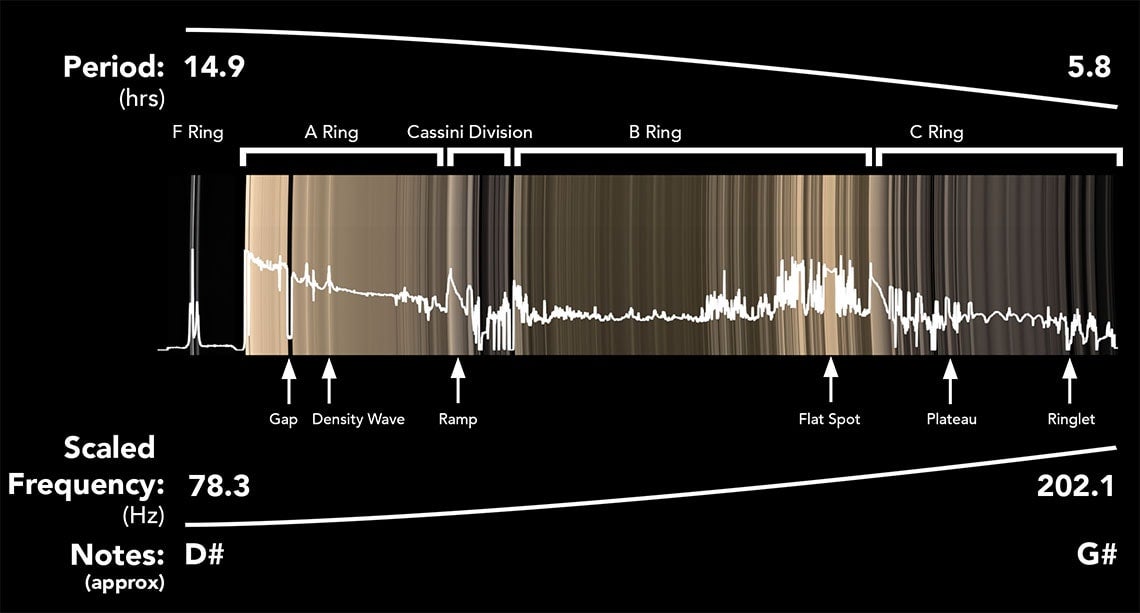 The local orbital periods, scaled frequencies, and musical notes of Saturn's main ring system. The brightness profile of the un-illuminated side of the rings was used to modulate the volume of the constantly changing note. (Courtesy of SYSTEM Sounds/NASA/JPL/Space Science Institute)
