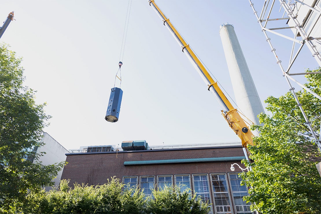 Each new boiler, standing two-storeys tall, was lifted by crane into a specially cut hole in the steam plant’s roof over the summer. The new units take up significantly less space than the old gas boiler, allowing the university to also add new heat pumps to further boost the steam plant’s energy performance.