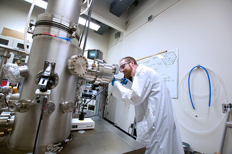 Graduate student Matthew Timm prepares a scanning tunnelling microscope for an experiment controlling the outcome of a chemical reaction by selecting the impact parameter of molecular collisions (photo by Diana Tyszko)
