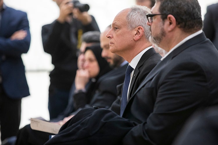Photos of the victims were projected on a screen in the front of the room, which was packed to capacity. Others watched the ceremony on a video feed in a separate room.