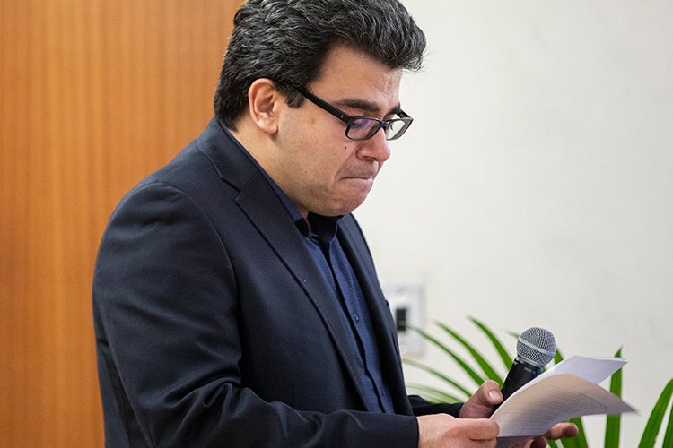 Professor Yashar Ganjali, of the department of computer science, reads a poem in Farsi and English (photo by Nick Iwanyshyn)