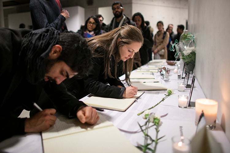 Attendees enter messages into memorial books for each U of T community member whose name was on the plane’s passenger manifest (photo by Nick Iwanyshyn)