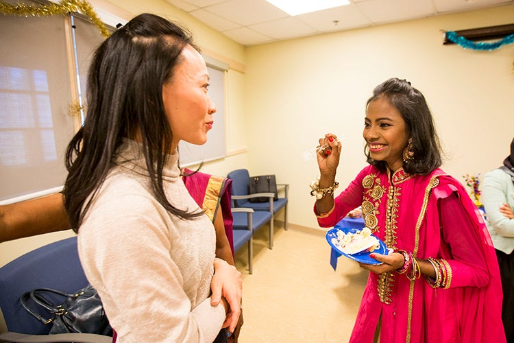 Acid-attack survivor Das (right) smiles after feeding cake to Dr. Toni Zhong during a party thrown for Das at Toronto General Hospital (photo by Carlos Osorio/Toronto Star via Getty Images)
