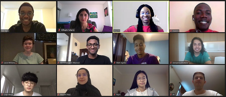 Students and staff from three InVEST projects participate in an intercultural learning session held July 16, 2020. Left to right, top to bottom: Tobi Edun, Elham Marzi, Anuli Ndubuisi, Malama, Laura Williams, Mohamed Mbarouk, Matt Jagdeo, Sampanna Bhattarai, Chao Wang, Maryam Naqi and Rayni Li, Ali Khan (photo courtesy Elham Marzi)
