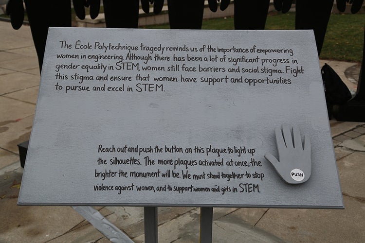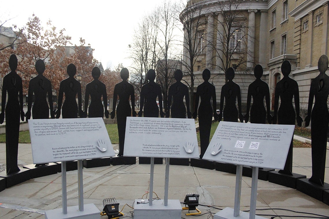 The U of T Engineering students' monument features 14 silhouettes arranged in a semi-circle – each bears white lights in the shape of a memorial ribbon that observers can light by pressing a button on one of three informational plaques.