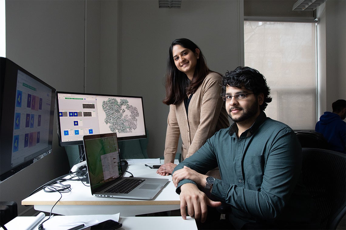 U of T PhD candidate Ali Punjani (right) is CEO of the U of T startup Structura Biotechnology, which is built on research he did during his PhD in computer science at U of T. His sister, Saara Virani (left), is the company’s chief operating officer (photo by Chris Sorensen)