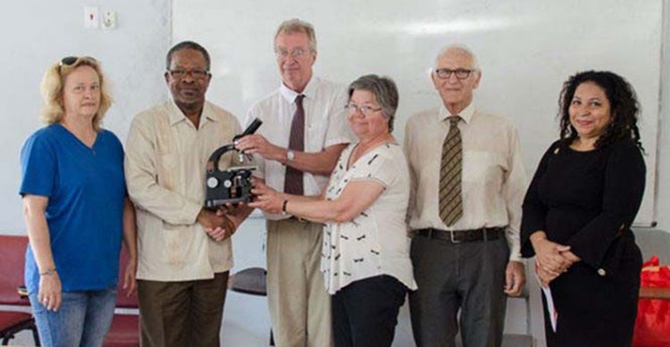 Professor Emeritus Daniel Schulze (third from left) presents the microscopes from U of T to the University of Guyana (photo courtesy of the University of Guyana)