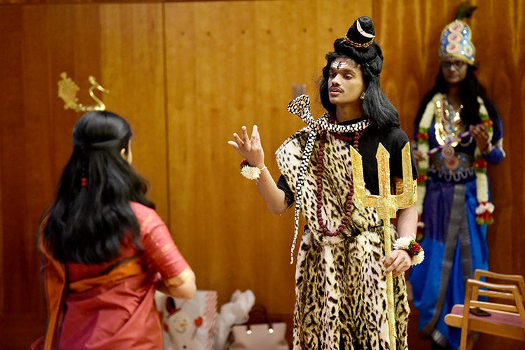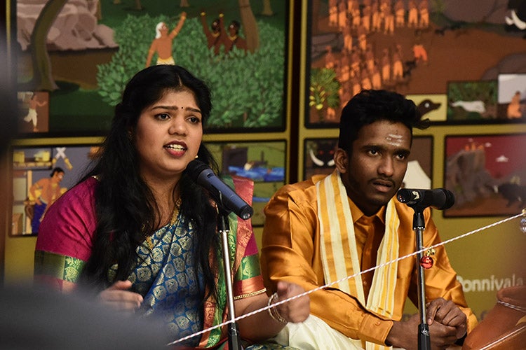 The night’s feature event, a traditional Tamil performance, was used to tell an epic tale. The performance was a Villu Paatu, or bow-song, an ancient storytelling form in which a massive bow strung with bells is struck to create music. It accompanies songs and narration.