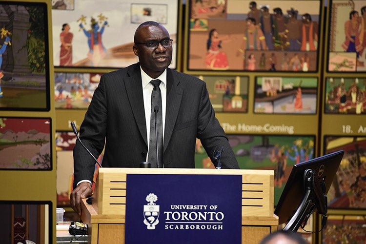Wisdom Tettey, the vice-president and principal of U of T Scarborough, speaks during the Tamil heritage celebration (photo by Joseph Burrell)