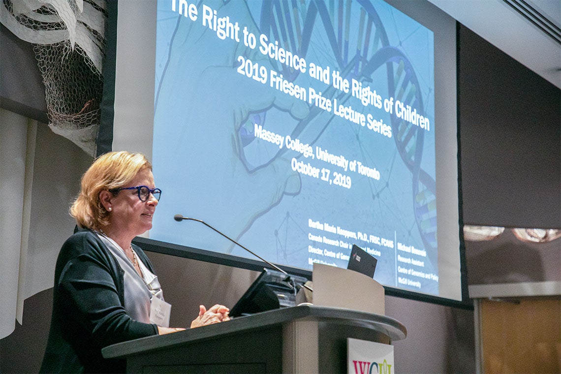 Knoppers, the winner of the 2019 Henry G. Friesen International Prize in Health Research, made the remarks during a Friesen Prize lecture at Women’s College Hospital that was co-sponsored by U of T’s Schwartz Reisman Institute for Technology and Society, a new interdisciplinary home for scholars studying the impact of technology and innovation on society. Other sponsors included U of T’s Joint Centre for Bioethics, Massey College and Friends of the Canadian Institutes of Health Research.