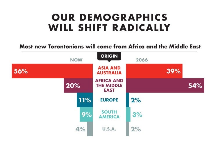 The piece predicts that the population of the GTA will reach 13.1 million and almost half – 47 per cent of residents – will be from somewhere else. Their numbers will hit about 6.6 million, triple the current level. Most of the newcomers will be from Africa and the Middle East, followed by Asia and Australia.