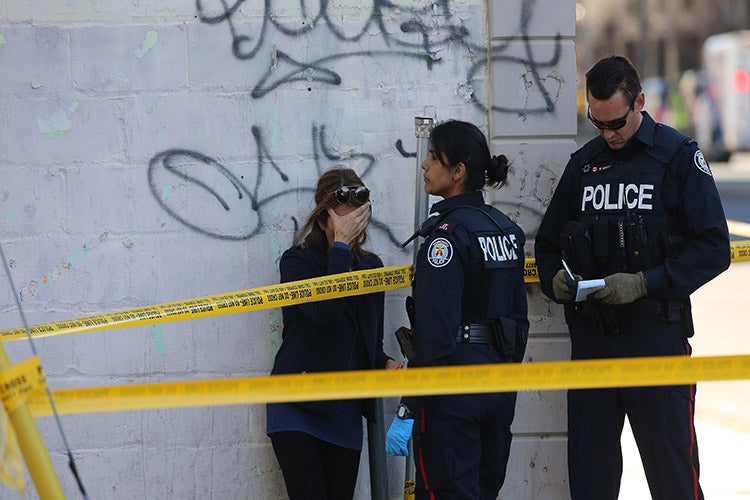 A woman covers her face as police shut down parts of Yonge Street Monday after a van struck pedestrians between Sheppard and Finch avenues (photo by Steve Russell/Toronto Star via Getty Images)
