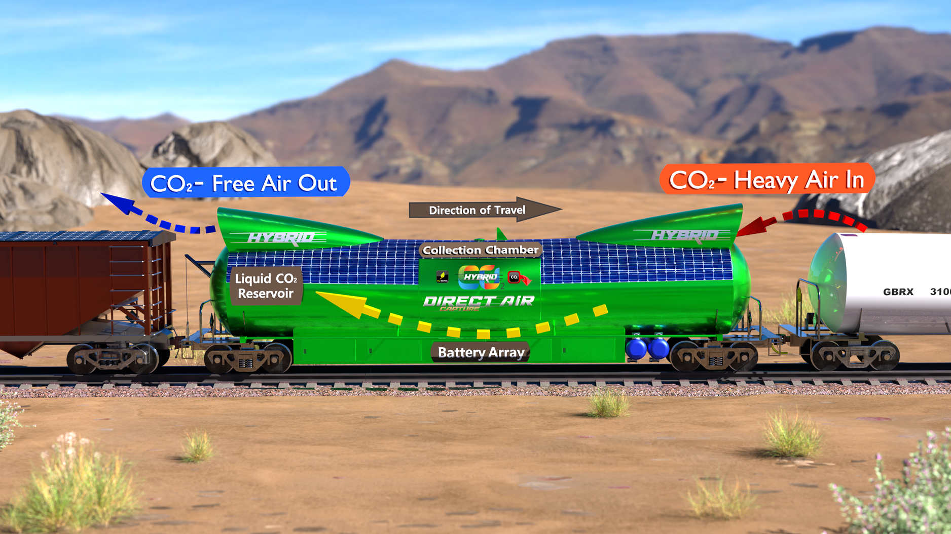 DAC rail cars work by using large intakes that extend up into the slipstream of the moving train to move ambient air into the large CO2 collection chamber and eliminate the need for energy-intensive fan systems that stationary DAC operations require. The air then moves through a chemical process that separates the carbon dioxide from the air, and the CO2-free air then travels out of the back of the car and returns to the atmosphere.