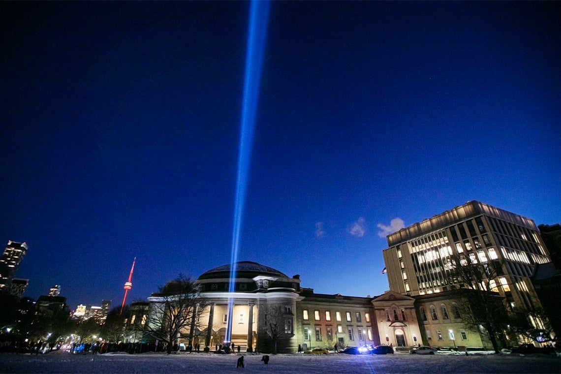 U of T joined 13 other engineering schools across Canada to mark the 30th anniversary of the École Polytechnique massacre by shining a spotlight into the night sky on Dec. 6, the National Day of Remembrance and Action on Violence Against Women.