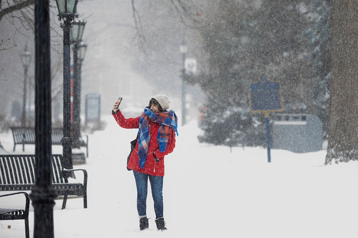 A woman stops to take a snowy selfie in February on the St. George campus.