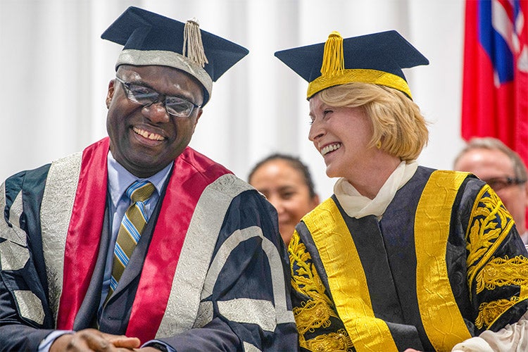 Wisdom Tettey, the vice-president and principal of University of Toronto Scarborough, shares a laugh with U of T Chancellor Rose Patten.