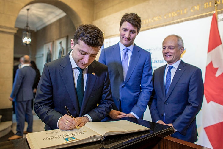 Ukrainian President Volodymyr Zelensky signs a guest book while Prime Minister Justin Trudeau and U of T President Meric Gertler look on during the Ukraine Reform Conference, which was hosted by U of T in July.