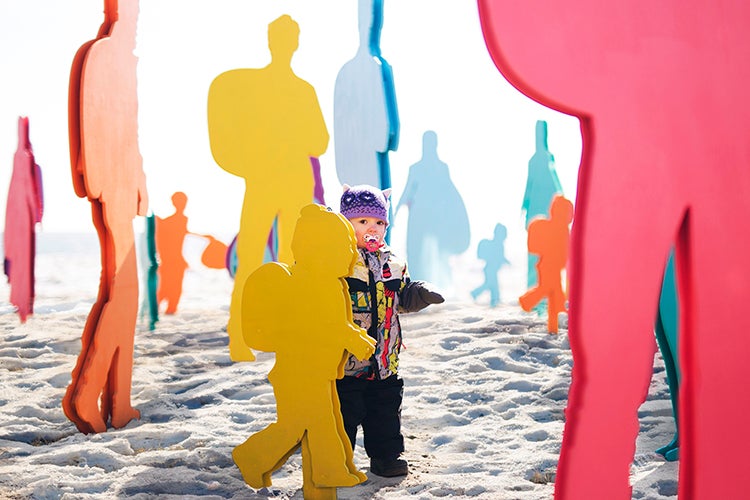 A young visitor interacts with a temporary art installation at Toronto's Woodbine Beach by U of T Assistant Professor Victor Perez-Amado and master of architecture students.