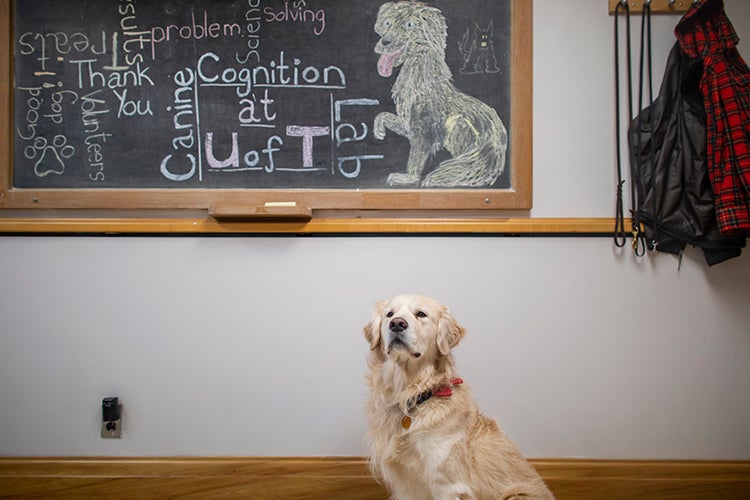 Loki, the golden retriever, poses below his chalkboard portrait in U of T's canine cognition lab, where researchers study how dogs think.