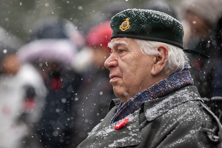 An early sprinkling of snow blanketed the annual Remembrance Day ceremony outside Hart House on the St. George campus this year.