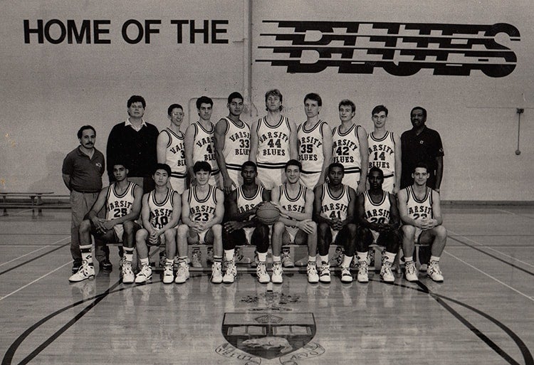 Actor and U of T alumnus David Sutcliffe (seated at the bottom right) played on the Varsity Blues basketball team during the 1989-1990 school year (photo courtesy of Varsity Blues)