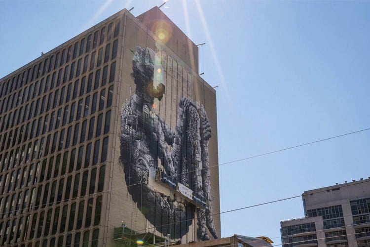 The giant mural at Yonge and St. Clair by U.K. street artist Phlegm, was created in collaboration with StreetARToronto.