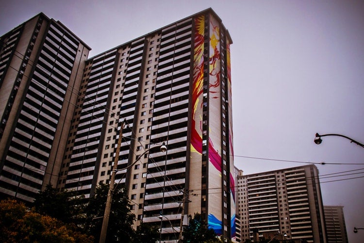 It was in St. James Town where STEPS completed one of their biggest – and tallest – projects: the World’s Tallest Mural in 2013. They saw the 32-storey social housing building at the corner of Wellesley and Sherbourne as a blank canvas, transforming its façade into a soaring phoenix.