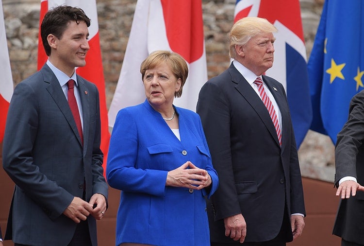 Canada's Prime Minister Justin Trudeau, Germany's Chancellor Angela Merkel and U.S. President Donald Trump during the G7 Summit last May in Italy (photo by Mandel Ngan/AFP/Getty Images)