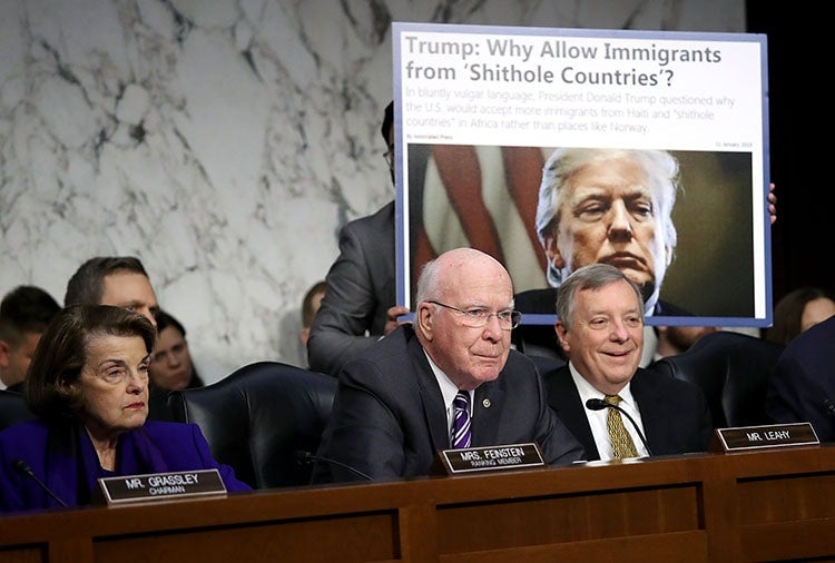 As U.S. Senator Richard Durbin looks on, Senator Patrick Leahy questions Homeland Security Secretary Kirstjen Nielsen during a hearing held by the Senate Judiciary Committee Jan. 16. Leahy and Durbin both questioned Nielsen about derogatory language reportedly used by U.S. President Donald Trump during a meeting on immigration (photo by Win McNamee/Getty Images)