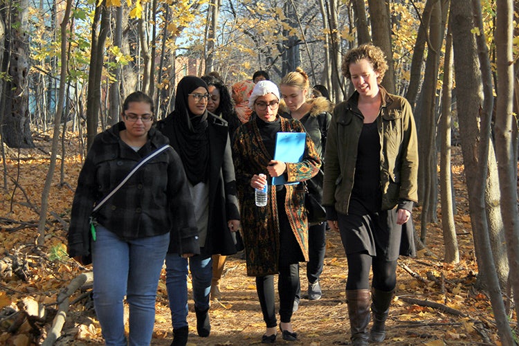Fiona Rawle (right), an associate professor, teaching stream in the department of biology at U of T Mississauga, talks to students on her walking office hours (photo by Blake Eligh)