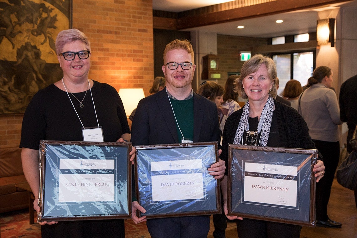 The three University of Toronto professors were among dozens celebrated at a reception for exemplary teachers at Massey College on Monday. Vice-President and Provost Cheryl Regehr recognized the winners of teaching awards across the university's three campuses, saying their efforts have helped U of T cement its reputation as the top university in Canada and one of the top 10 public universities in the world.