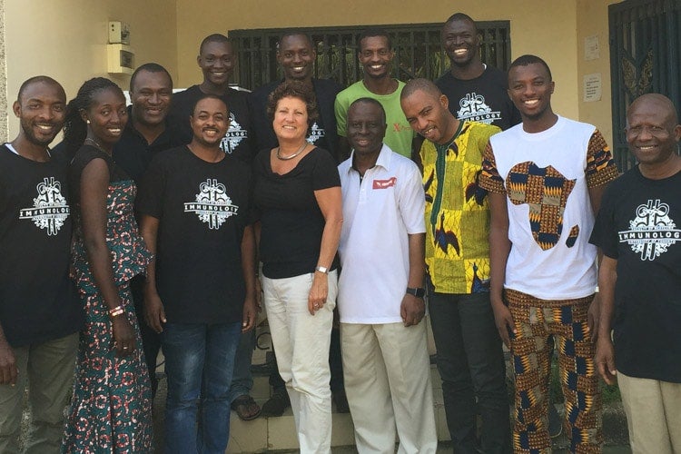 Eleanor Fish (fourth from left, bottom row) trained 11 Guinean health-care workers to do clinical trials during the pilot study (photo courtesy of Eleanor Fish)