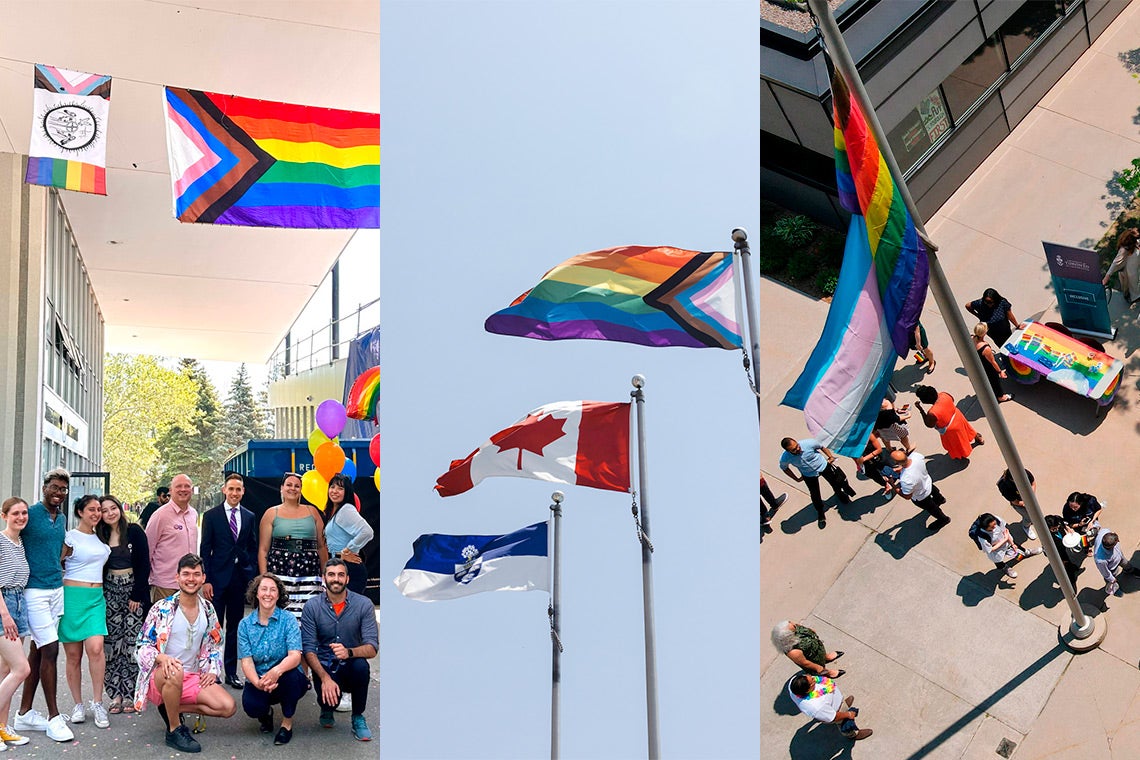 Flags were raised at U of T Mississauga, the St. George campus and U of T Scarborough to mark the beginning of Pride Month (photos by Angelia Meffe, Polina Teif and Don Campbell)