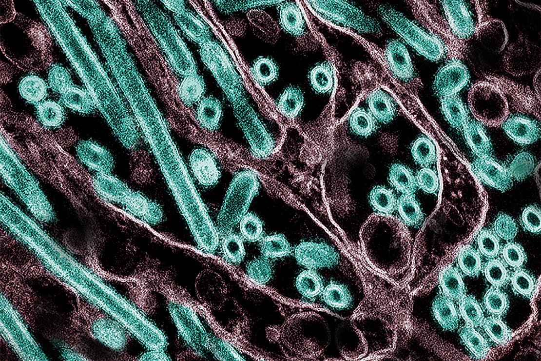 A colourized transmission electron micrograph of avian influenza A H5N1 virus particles, shown in green (microscopy by CDC; repositioned and recoloured by NIAID)
